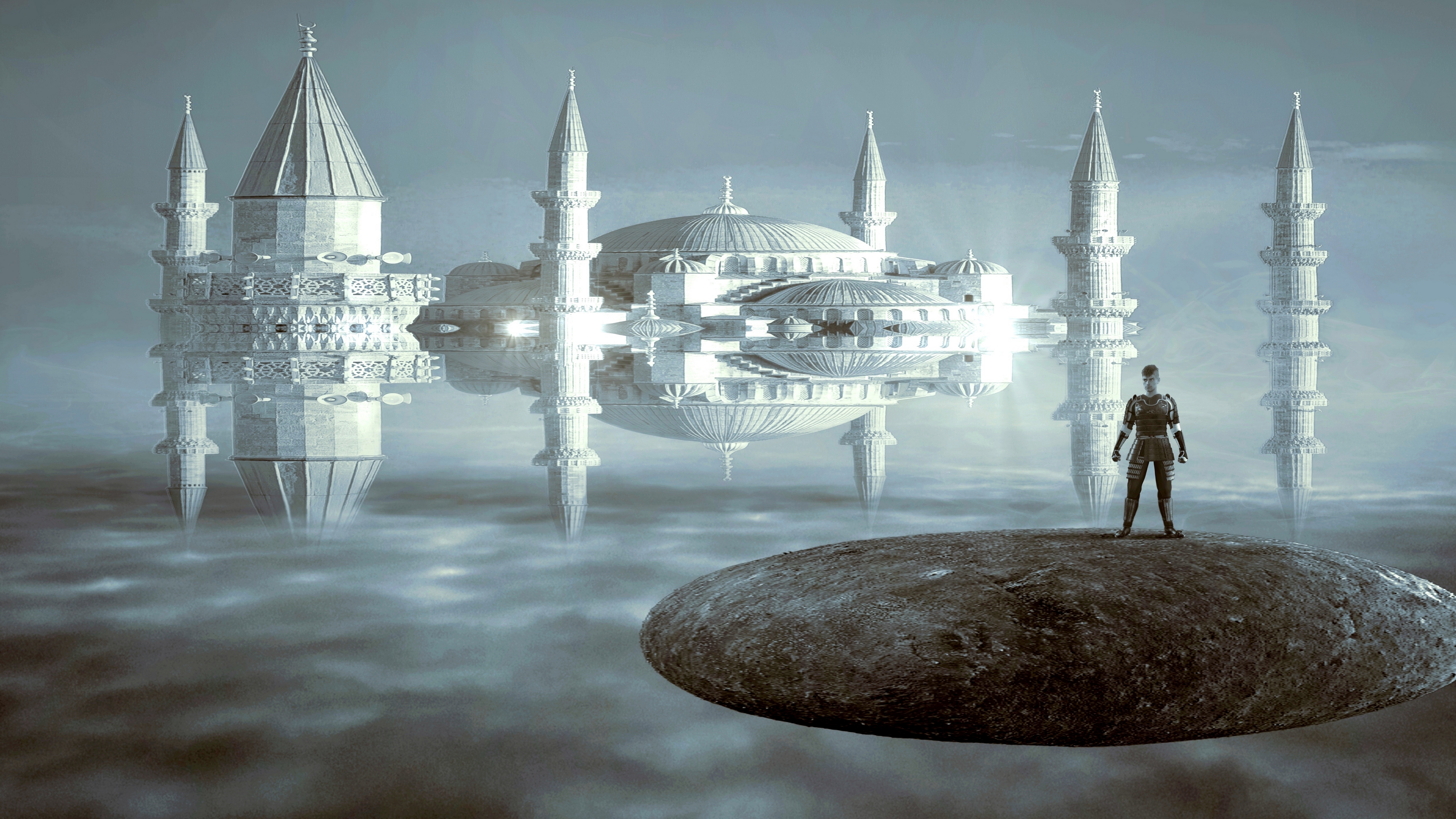 Description: A man standing on a rock in front of a castle with a reflection of it in the water and a sky.