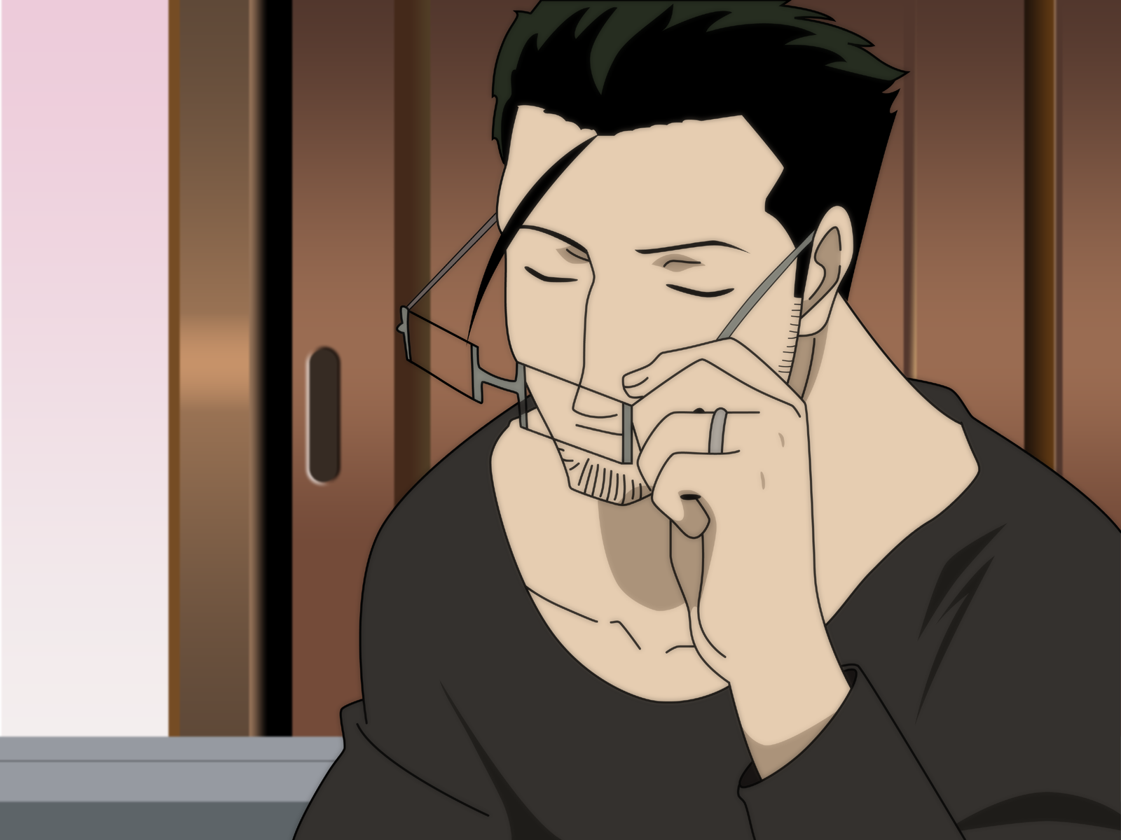 Description: A man talking on a cell phone while sitting down with his eyes closed and his hand on his chin.