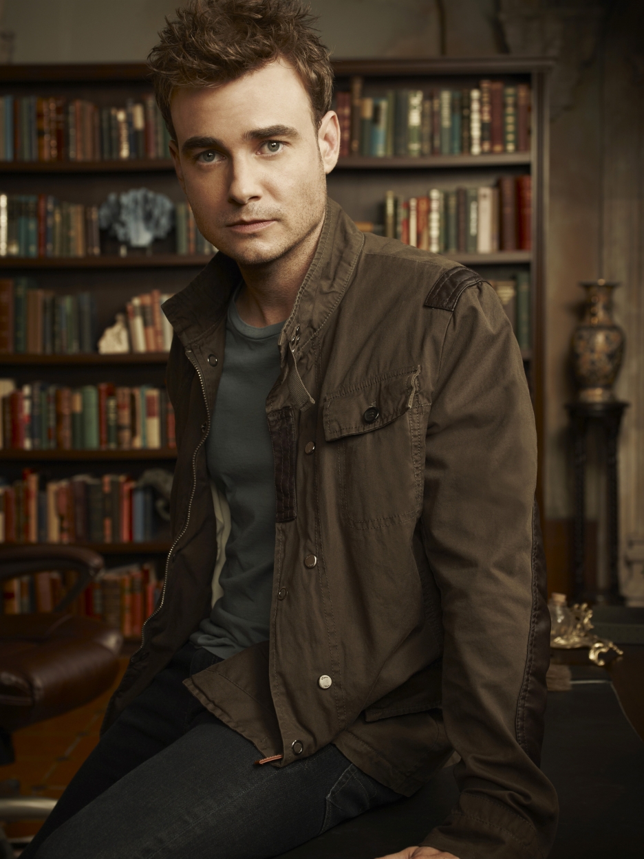 Description: A man sitting on a chair in front of a book shelf with books on it and a chair in front of him.