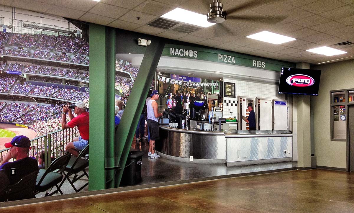 Description: A man sitting in a chair in front of a wall mural of a baseball stadium with a bar and a tv.