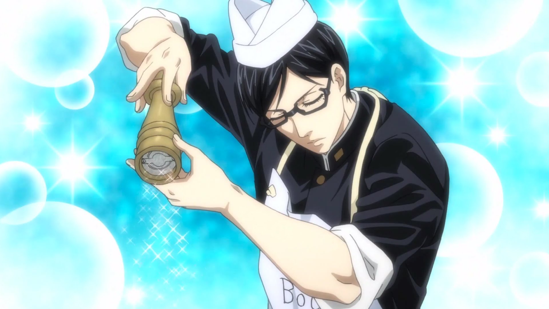 Description: A man in a chef's outfit is holding a bottle of liquid and a clock in his hand.