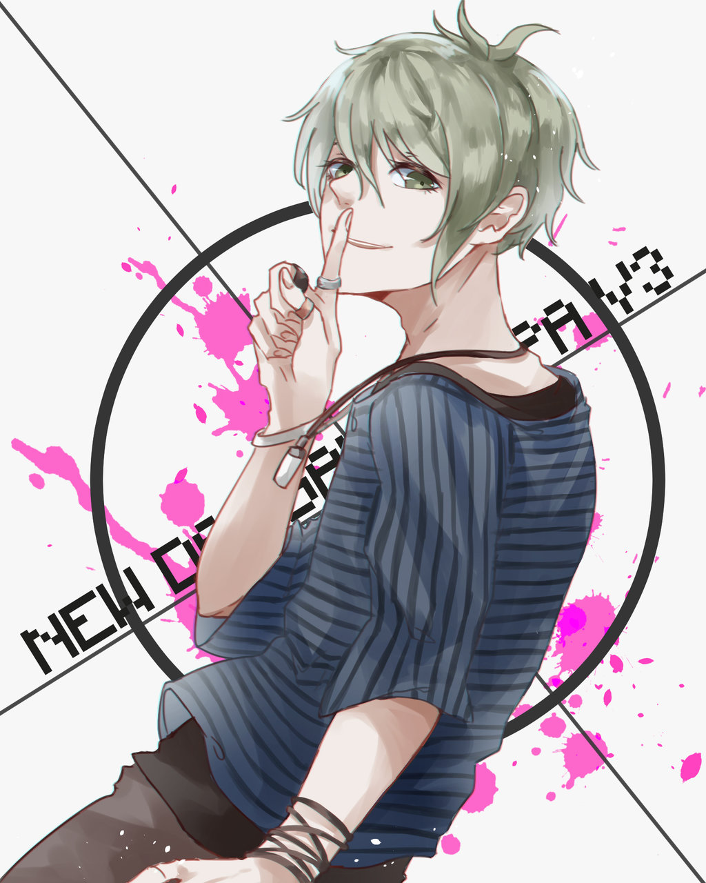 Description: A man with a cigarette in his mouth and a blue shirt on his shirt is standing in front of a pink spot.