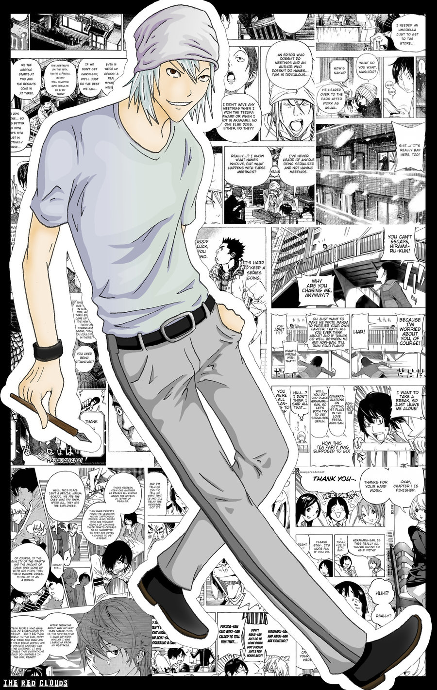 Description: A man with a cigarette and a newspaper background with a lot of comics on it.