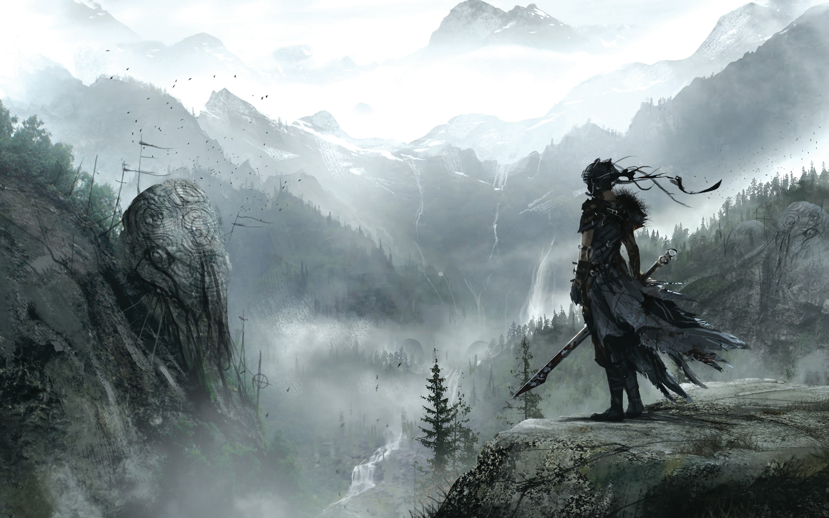 Description: A man standing on a cliff overlooking a mountain valley with a bird flying overhead and a bird flying overhead.