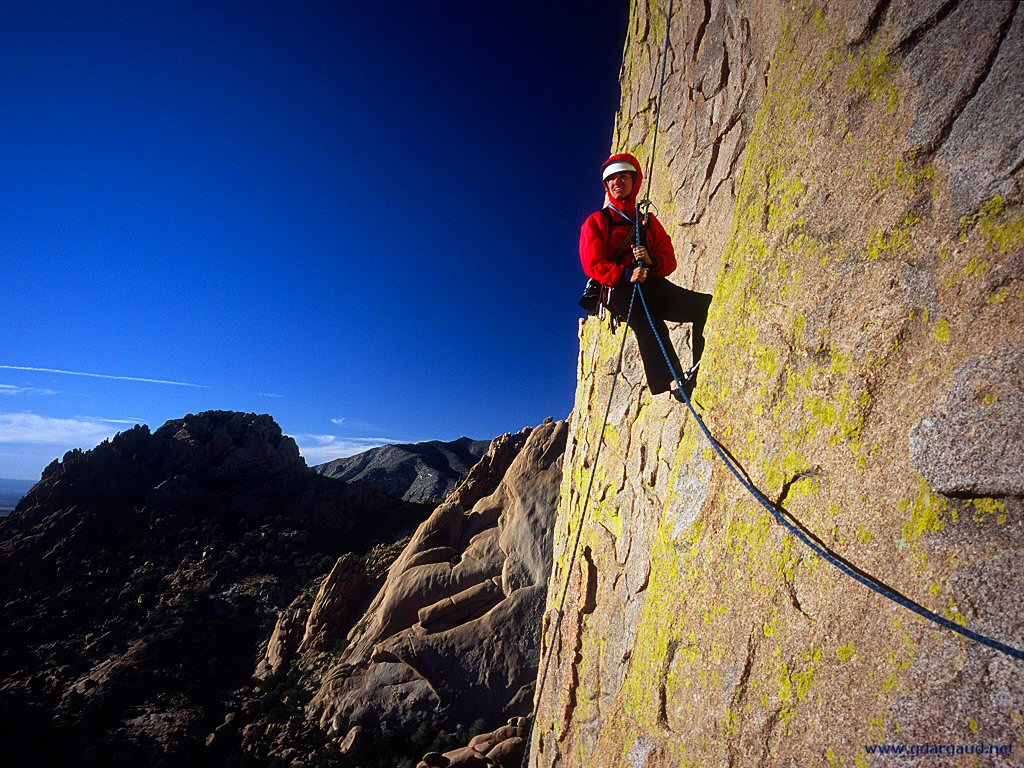 Description: A man climbing up the side of a mountain with a rope attached to it's side and a sky background.
