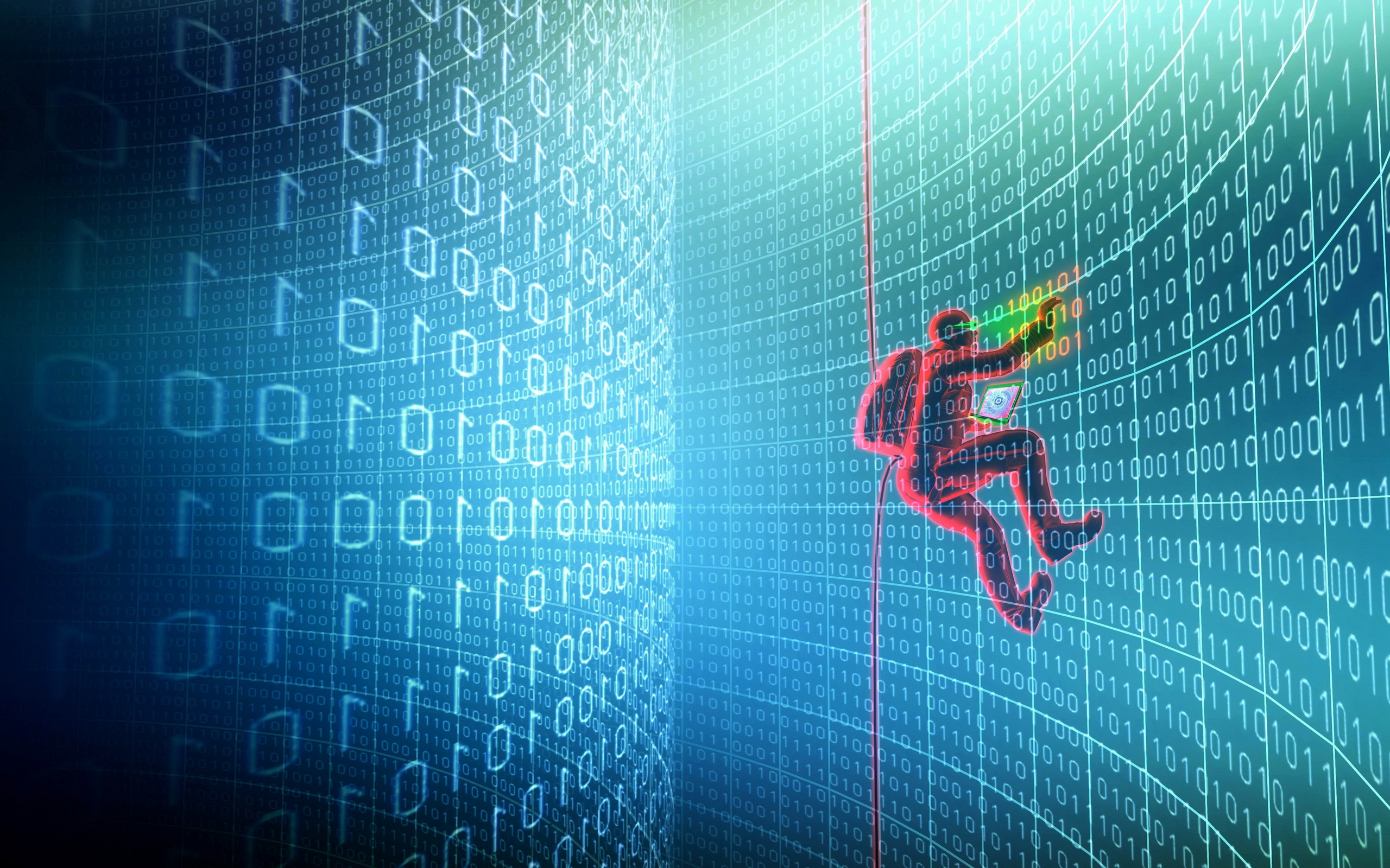 Description: A man climbing up a wall with numbers on it and a red arrow pointing up at him in the air.
