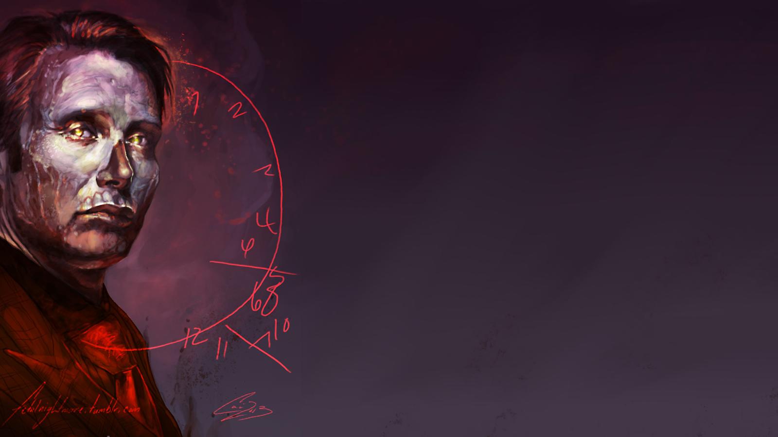 Description: A man with a clock face on his face and a red background with writing on it.