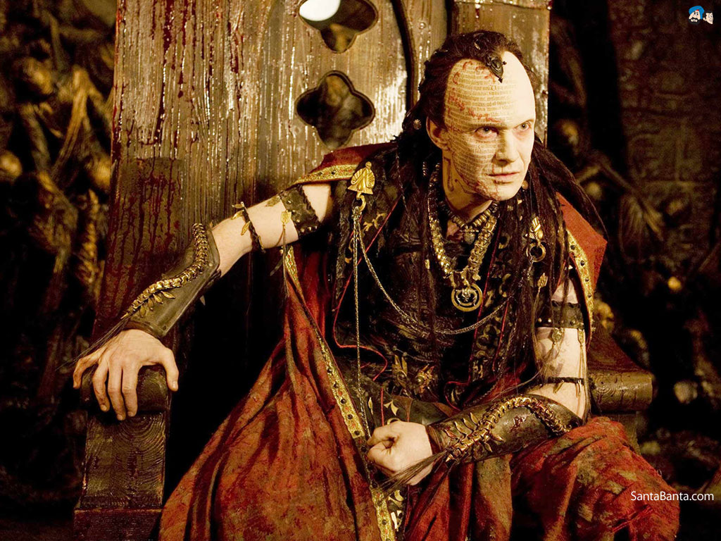 Description: A man dressed in a costume sitting on a chair with a lamp in the background and a wooden door.