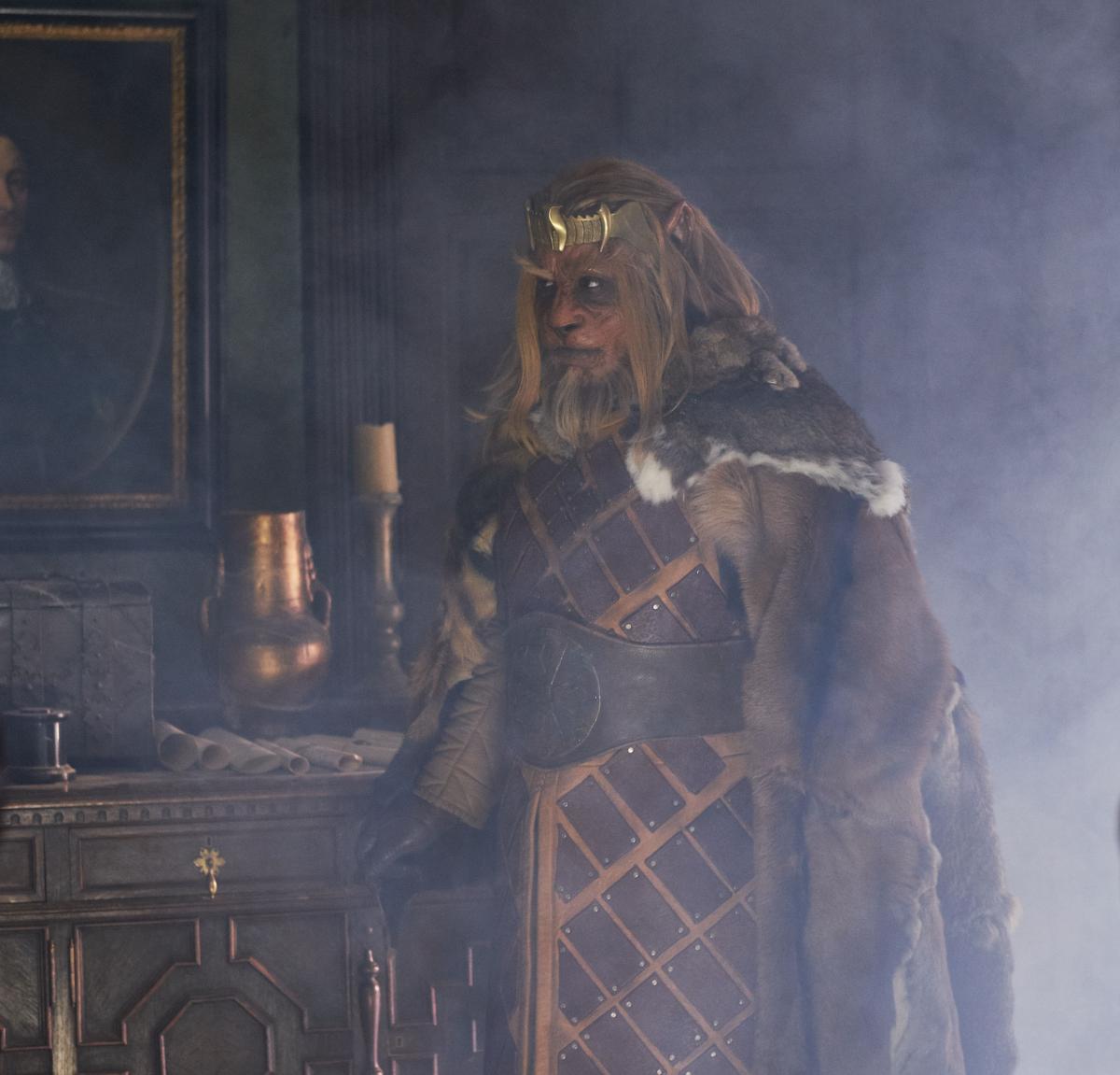 Description: A man dressed in a costume standing in a room with a fireplace and a mirror behind him.