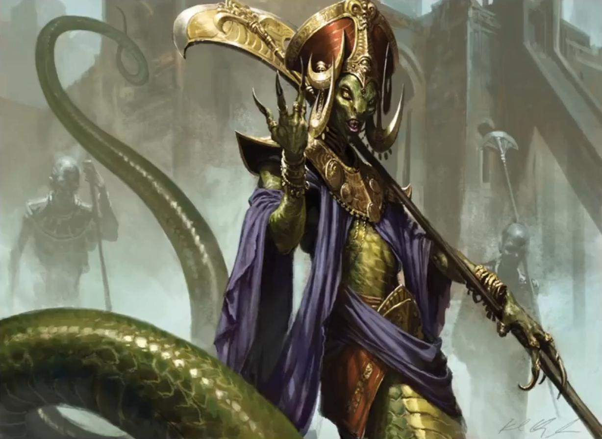 Description: A man in a costume holding a sword and a snake on a field of monsters in the background.