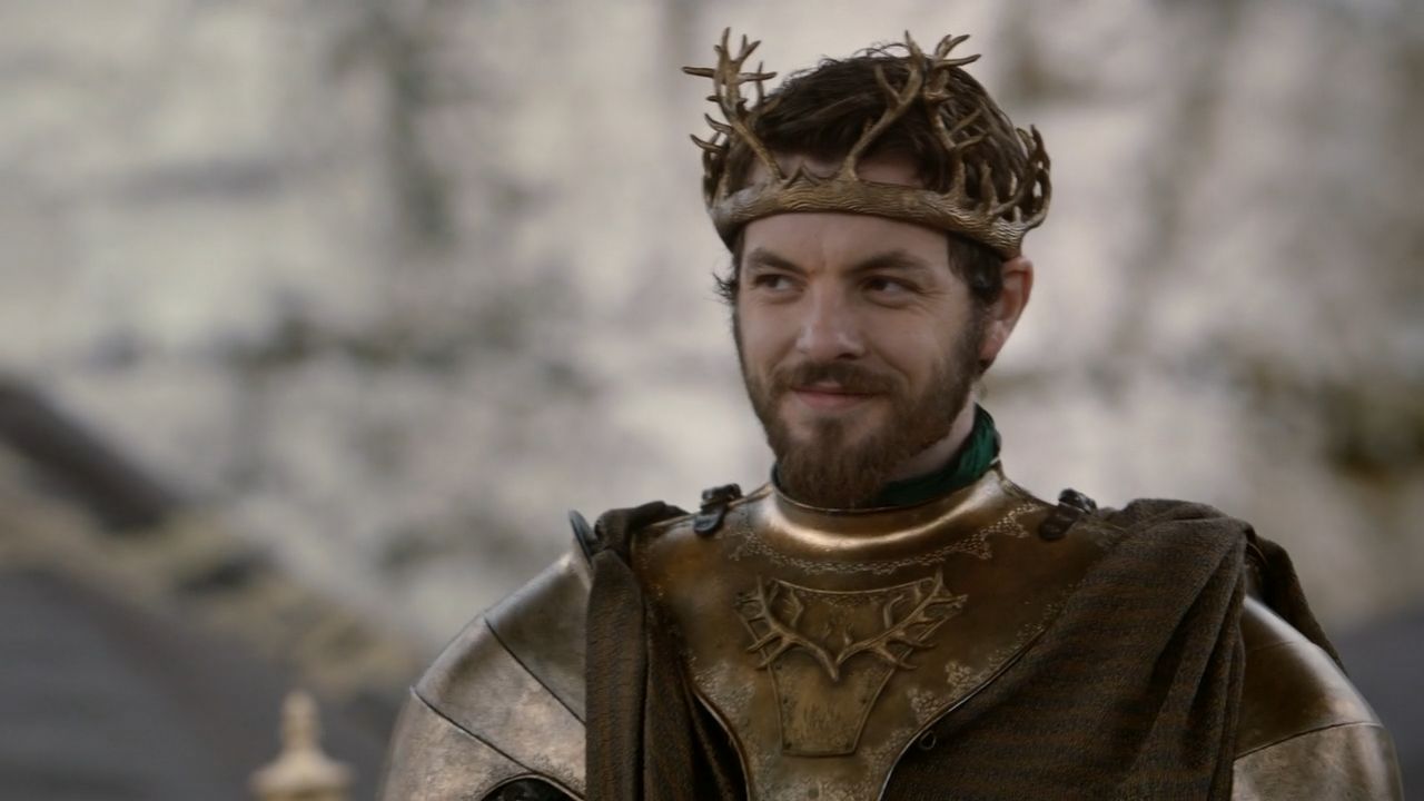 Description: A man in a crown and a beard wearing a suit of armor and a green collared shirt and a green tie.