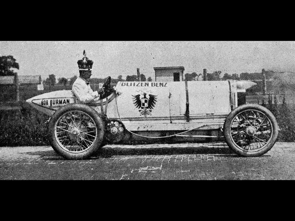 Description: A man in a crown sits in an old car with a german flag on it's side and a german flag on the side.