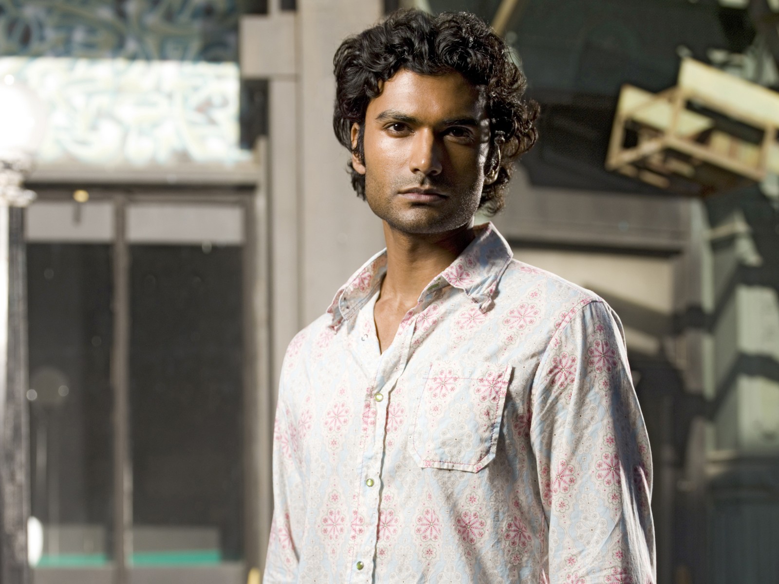 Description: A man with curly hair standing in front of a building with a crane in the background and a building with a sign on it.