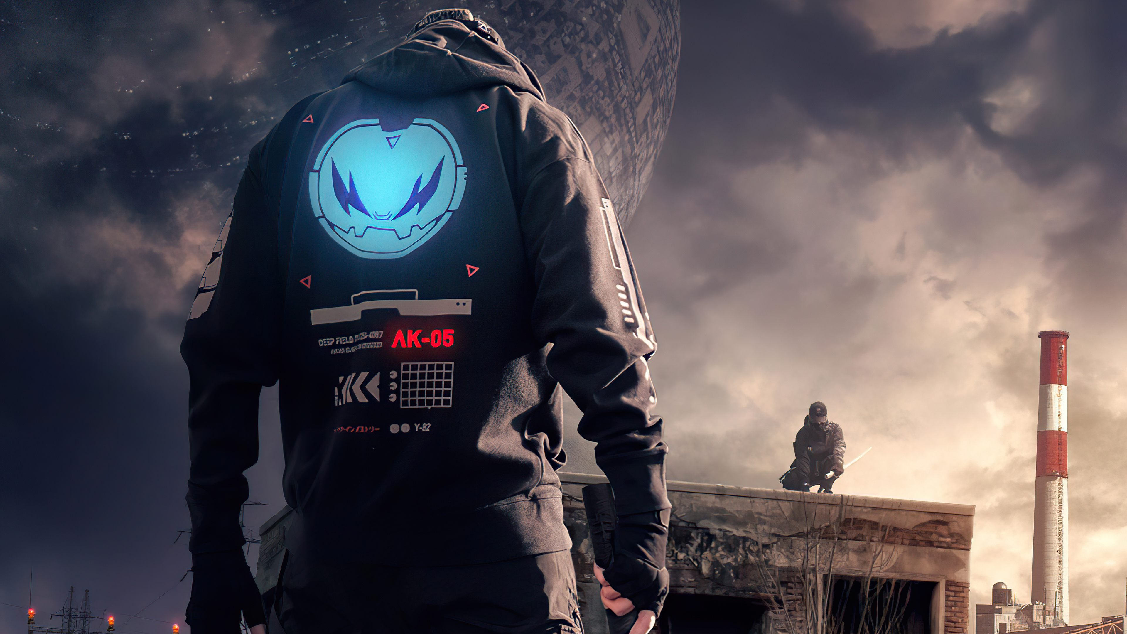 Description: A man in a black jacket standing in front of a building with a blue light on it's back.