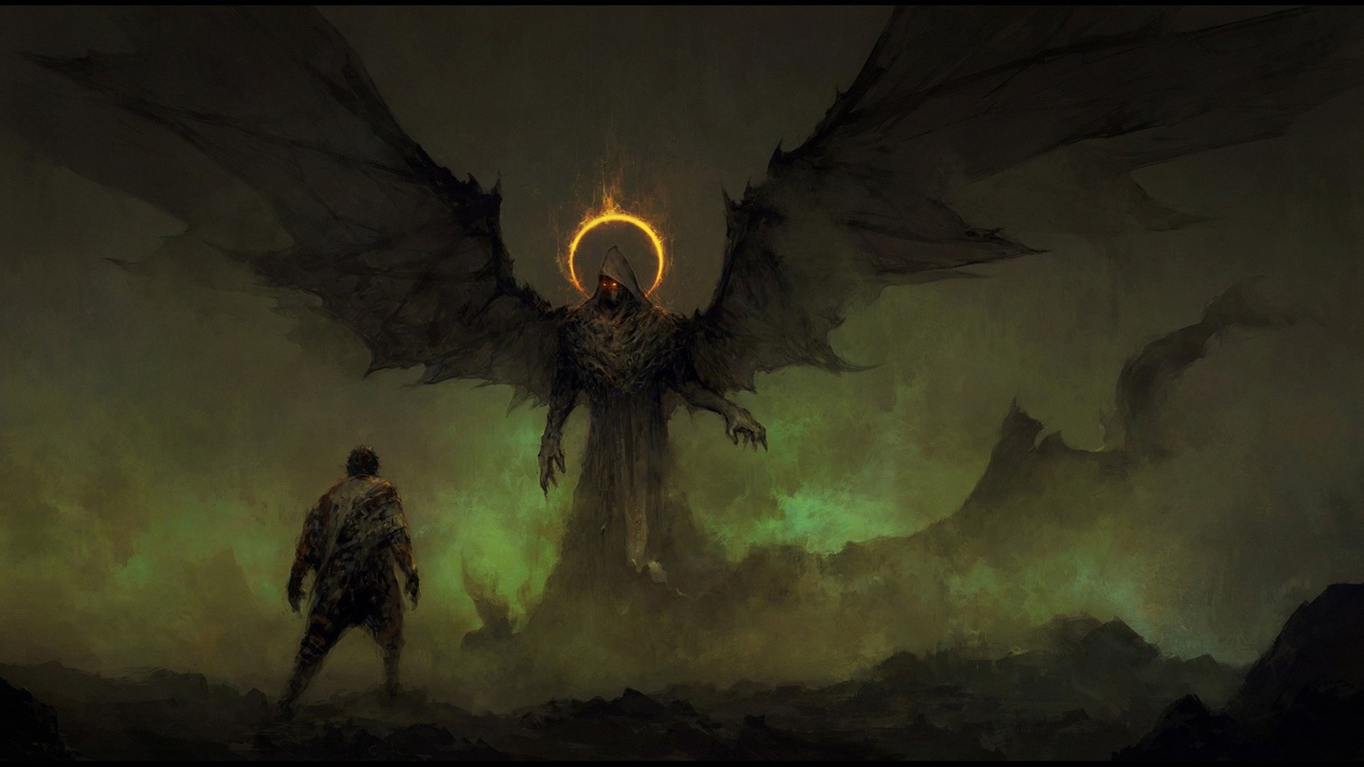 Description: A man standing next to a giant demon in a fog filled forest with a glowing ring in his mouth.