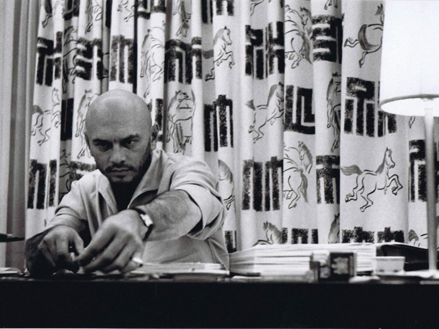 Description: A man sitting at a desk with a laptop computer in front of him and a curtain behind him with a horse drawn on it.