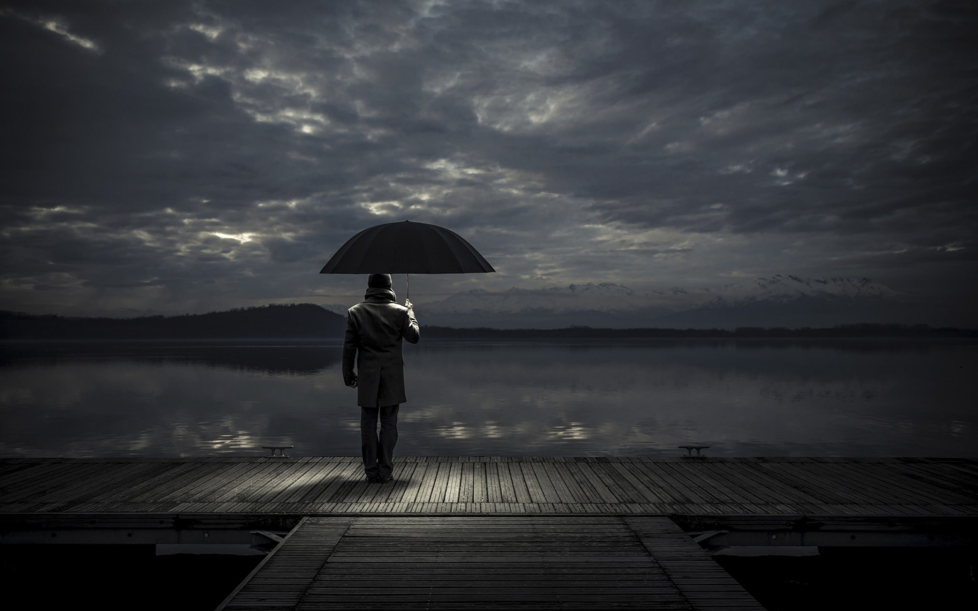 Description: A man standing on a dock holding an umbrella under a cloudy sky over a lake at night with a dock and dock.