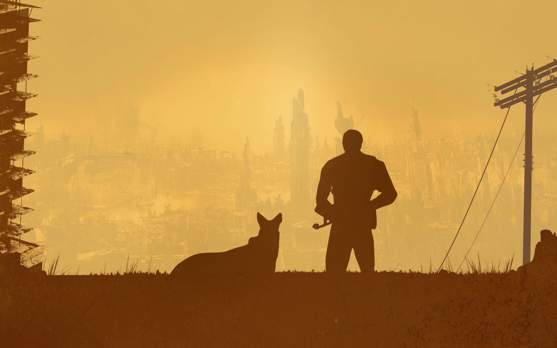 Description: A man standing next to a dog on a field with a city in the background at sunset or dawn.