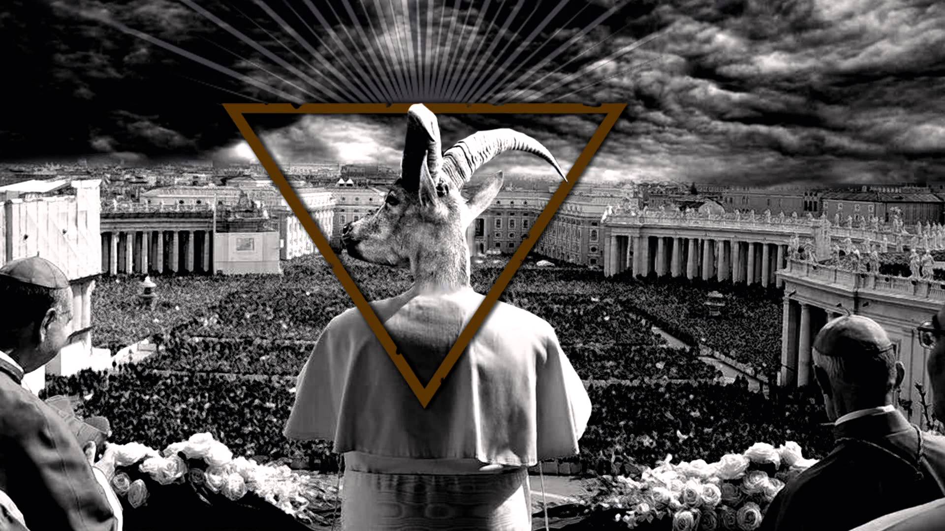 Description: A man in a white shirt and a dog in a black and white photo with a triangle over his head.