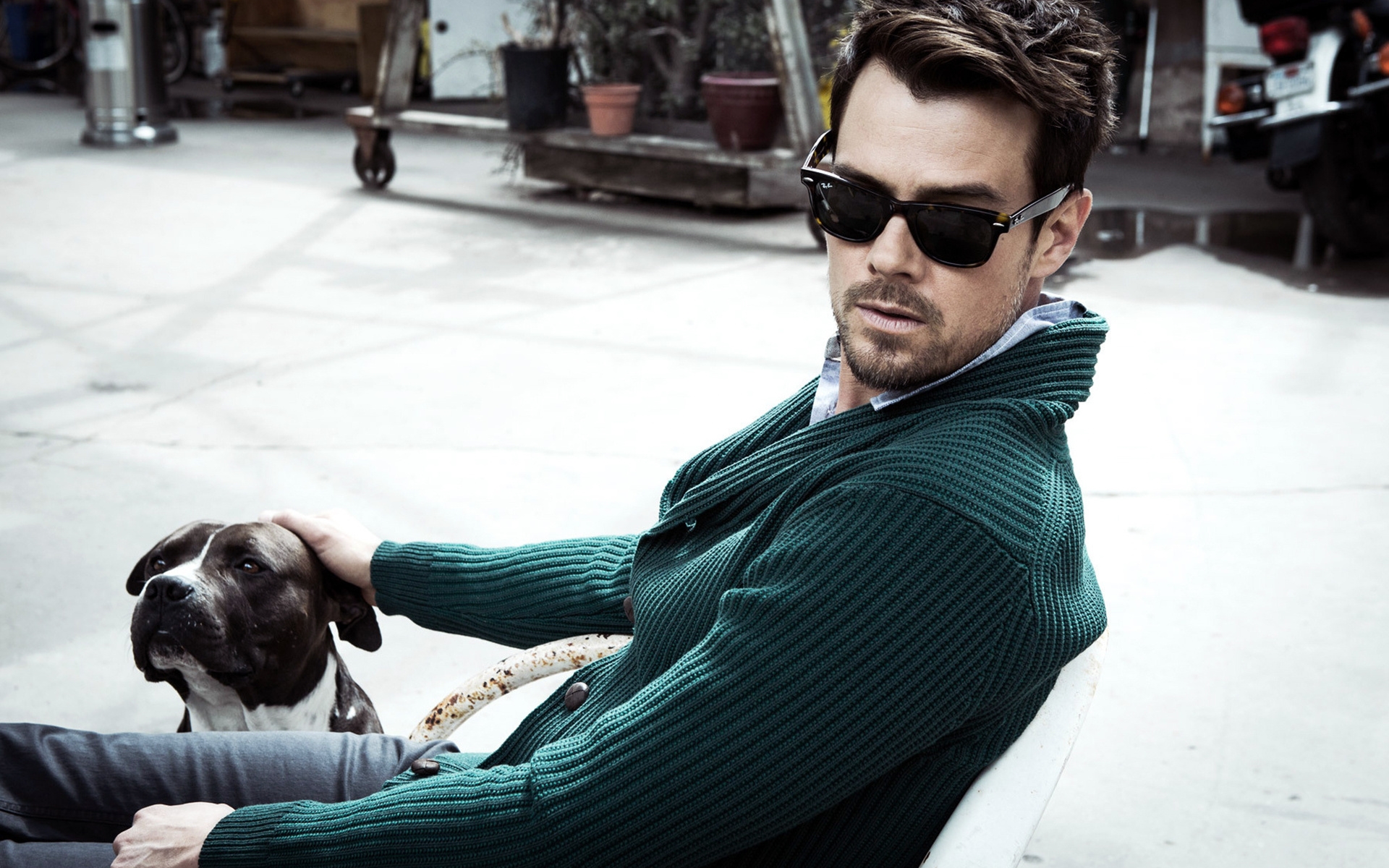 Description: A man sitting on a bench with a dog in his lap and wearing sunglasses on his head and a green sweater.