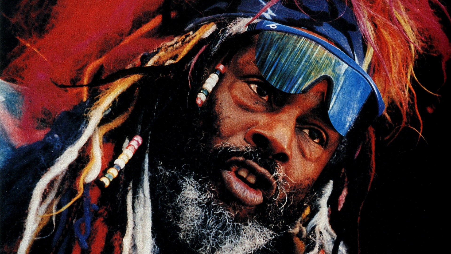 Description: A man with dreadlocks and a beard wearing a colorful headdress and a blue hat with feathers.