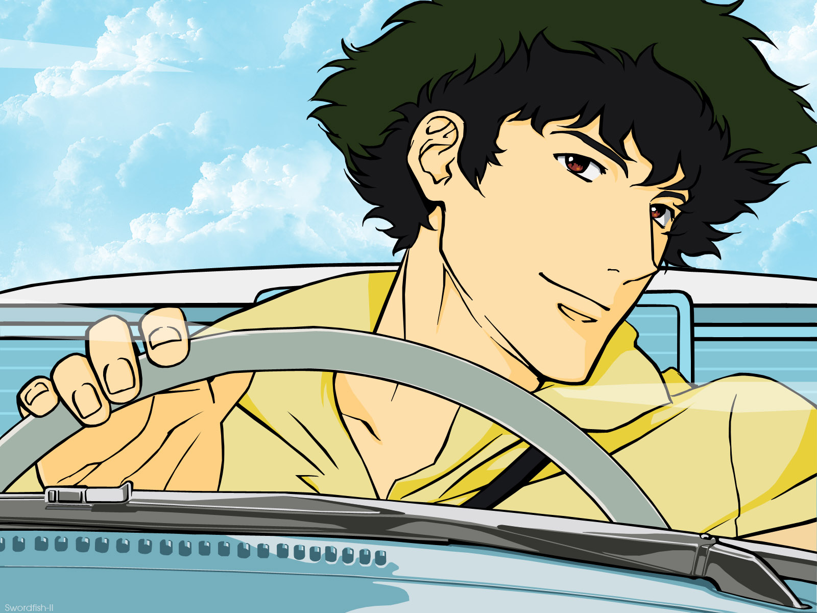 Description: A man driving a car with a steering wheel in his hand and a blue sky in the background with clouds.