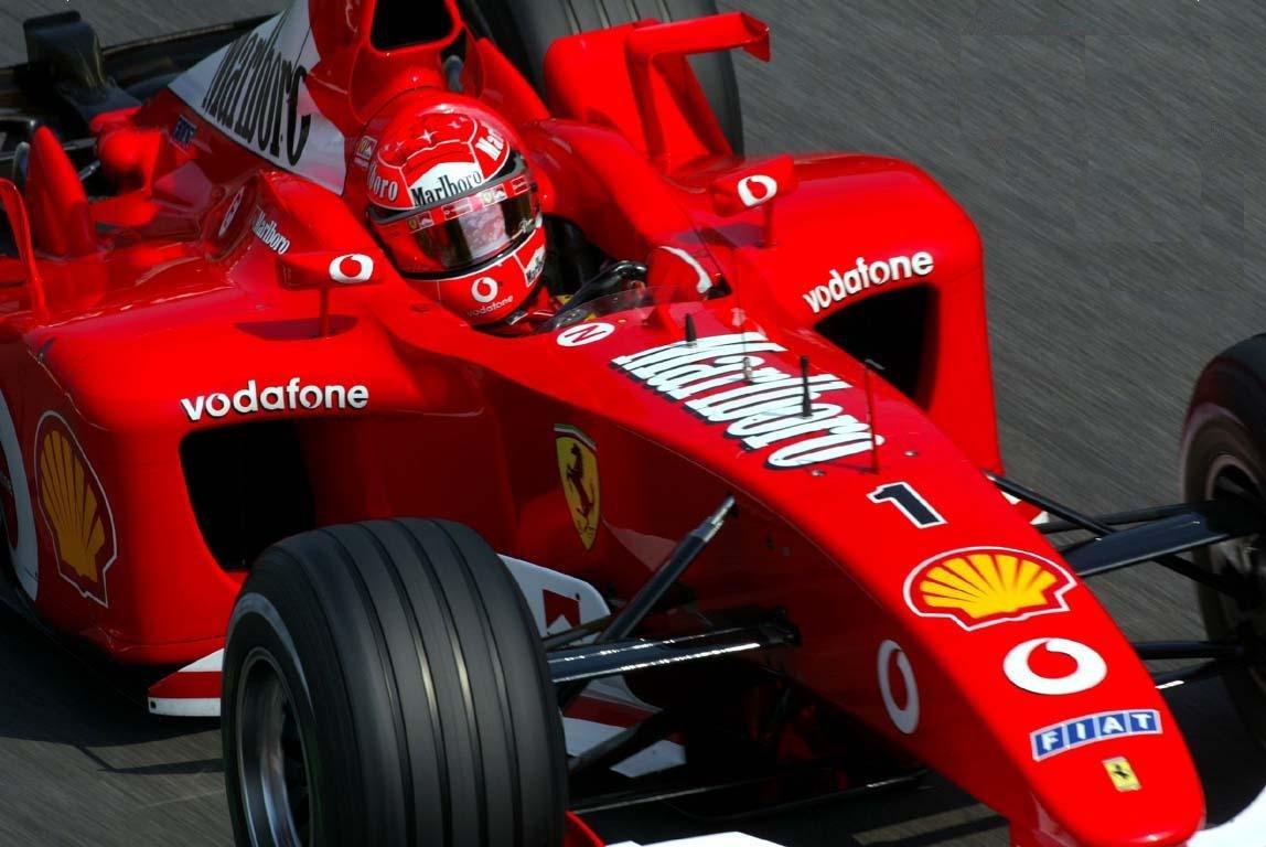 Description: A man driving a red race car on a track with a helmet on and a helmet on his head.