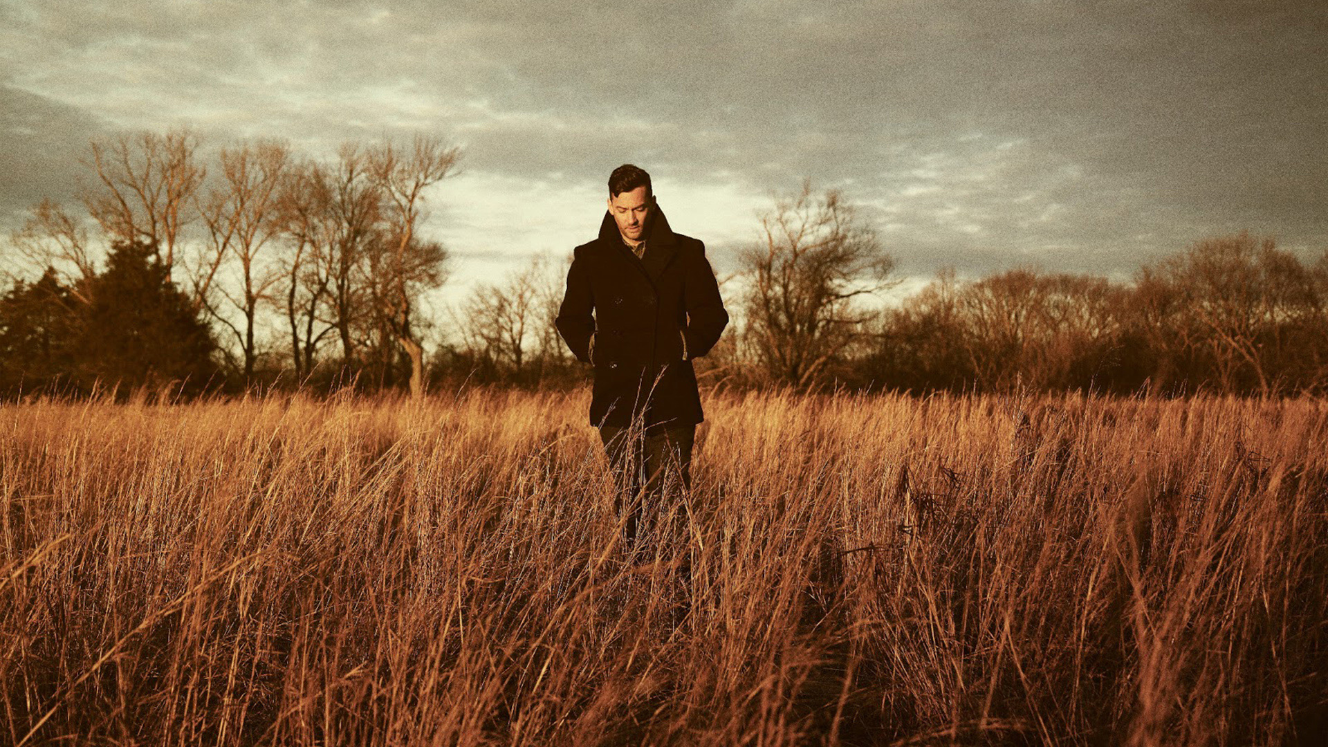 Description: A man standing in a field of tall grass with trees in the background and a cloudy sky in the background.
