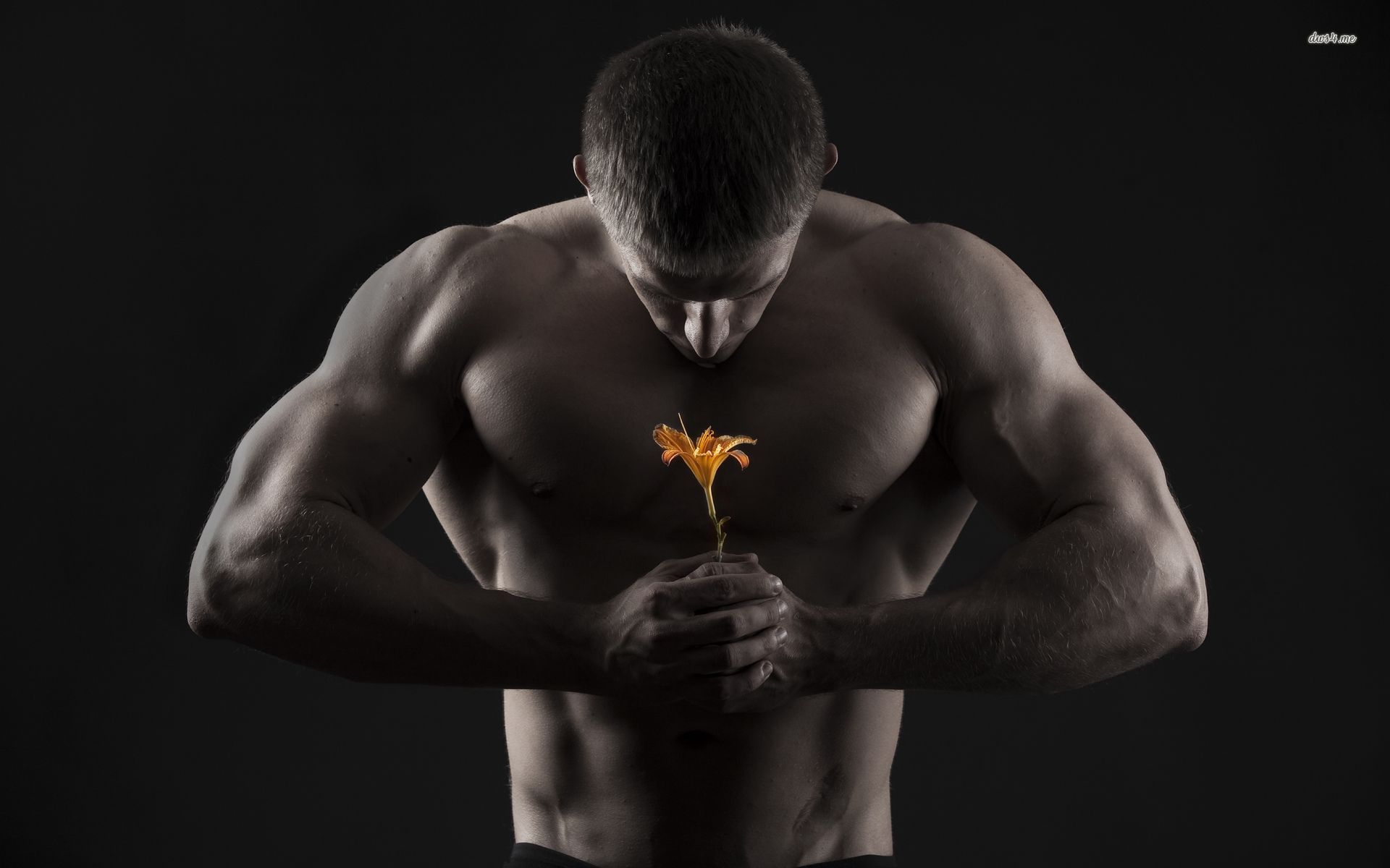 Description: A man with a flower in his hand and a black background with a white border around him and a black background with a white border.