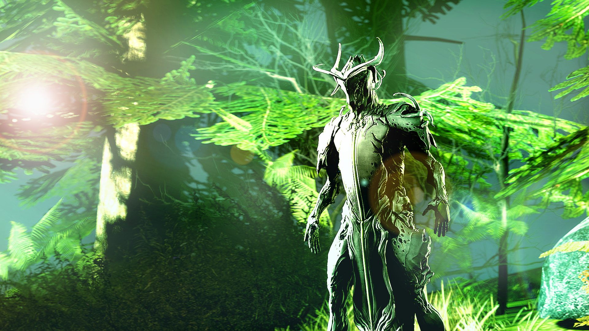 Description: A man standing in a forest with a giant green creature in his hand and a light shining on him.