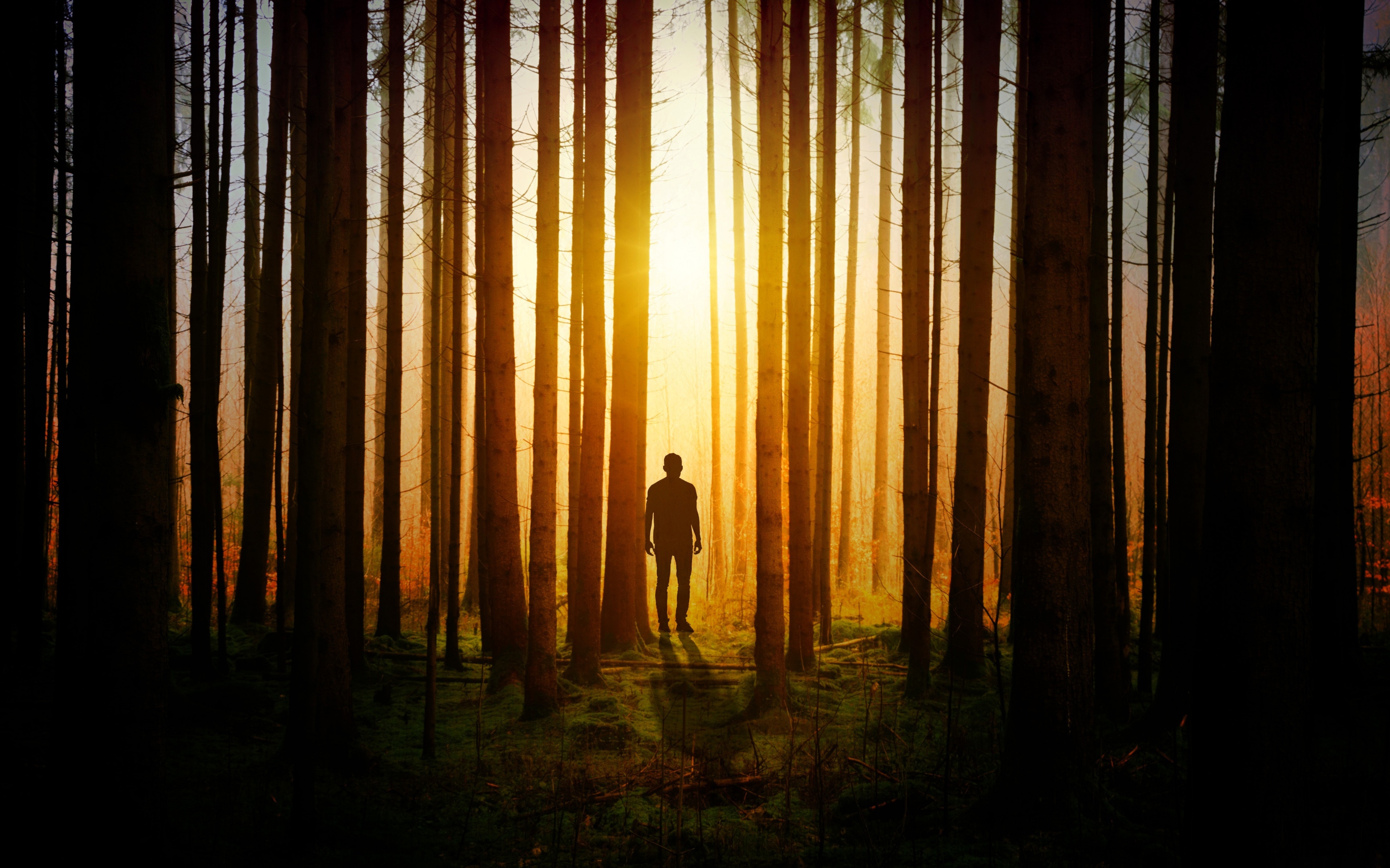 Description: A man standing in the middle of a forest at sunset with the sun shining through the trees behind him.