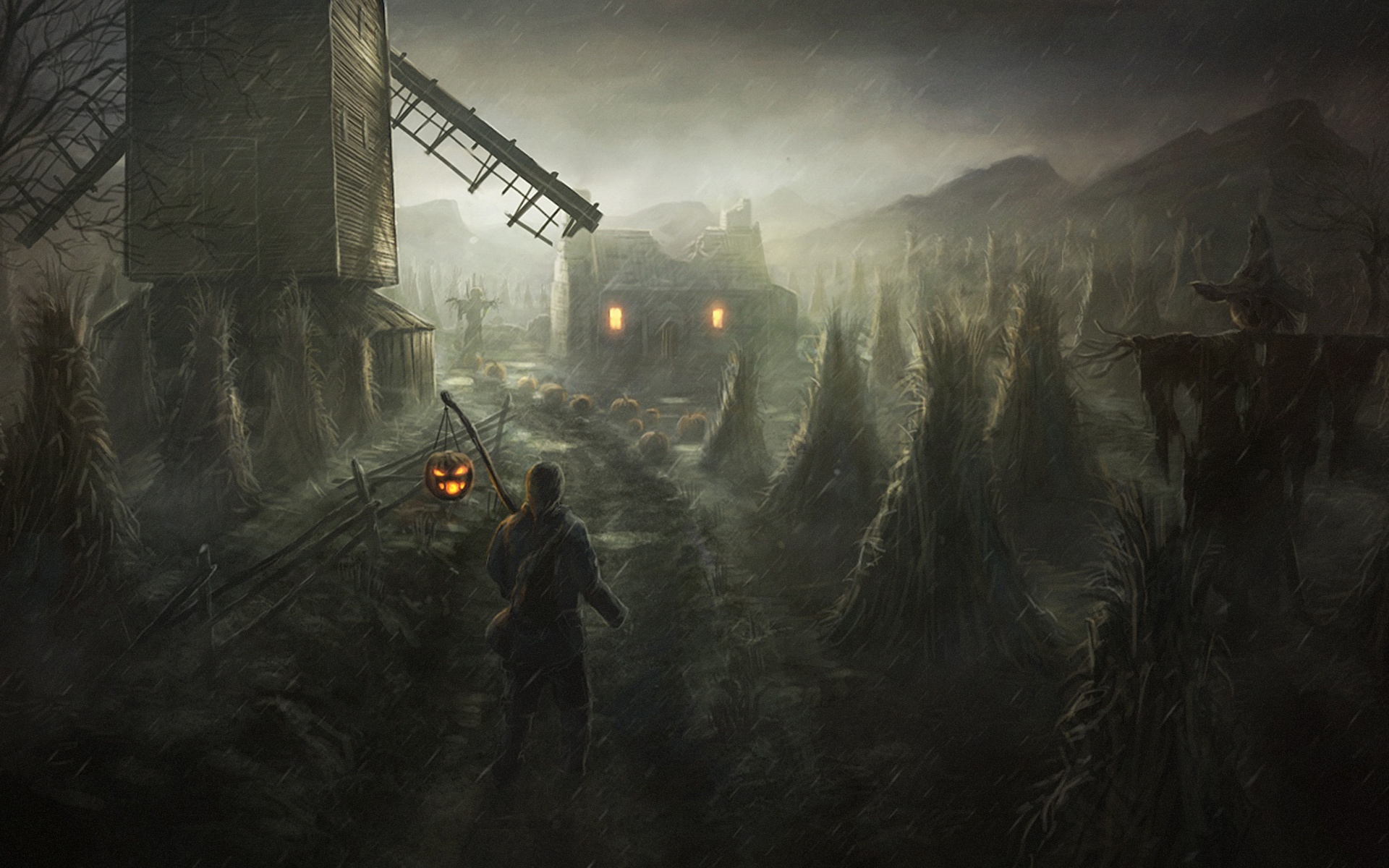 Description: A man standing in a forest next to a windmill in the dark of night with a lantern in his hand.