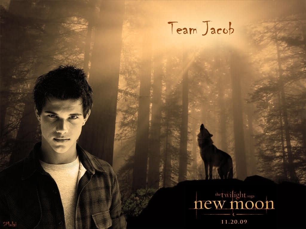 Description: A man standing in front of a forest with a wolf on it's back and a new moon on his chest.