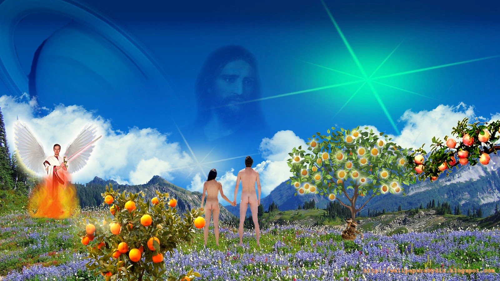 Description: A painting of a man surrounded by fruit trees and fruit trees with angels in the background and a blue sky.