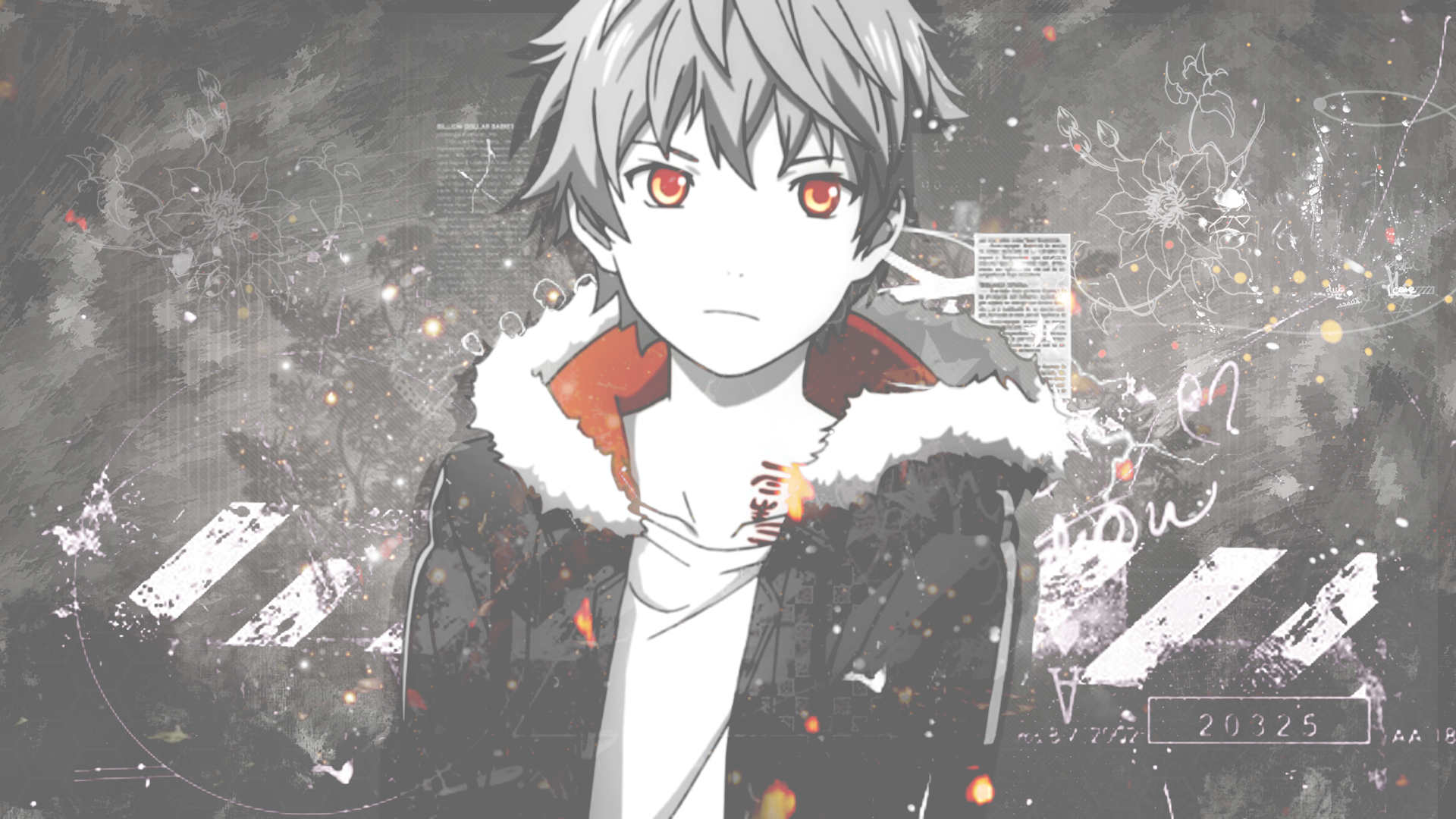 Description: A man with a fur collar and red eyes standing in front of a black background with a white and red design.