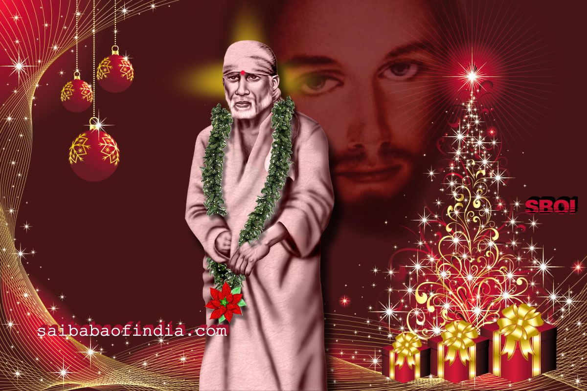 Description: A painting of a man with a garland around his neck and a christmas tree in the background with a red and gold background.