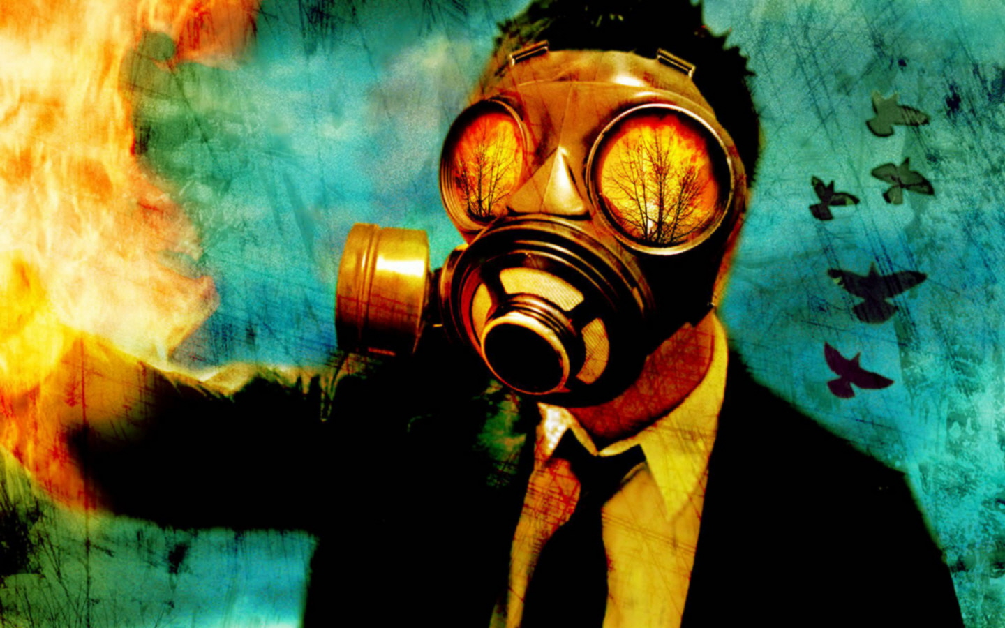 Description: A man wearing a gas mask holding a burning cigarette in his hand and a butterfly flying in the background.