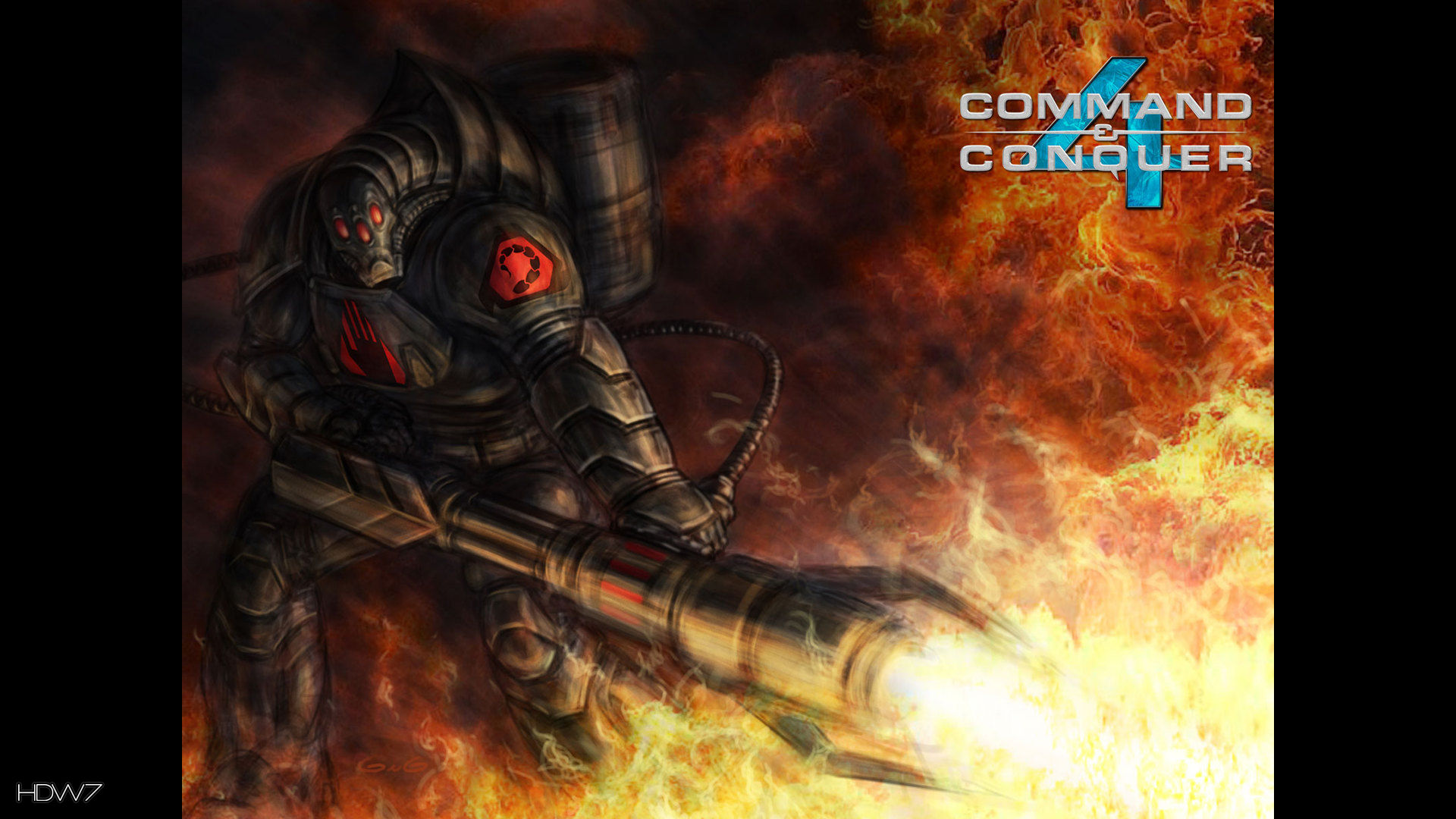 Description: A computer artwork of a man in a gas mask holding a rocket in front of a fire background with the words command conquer.