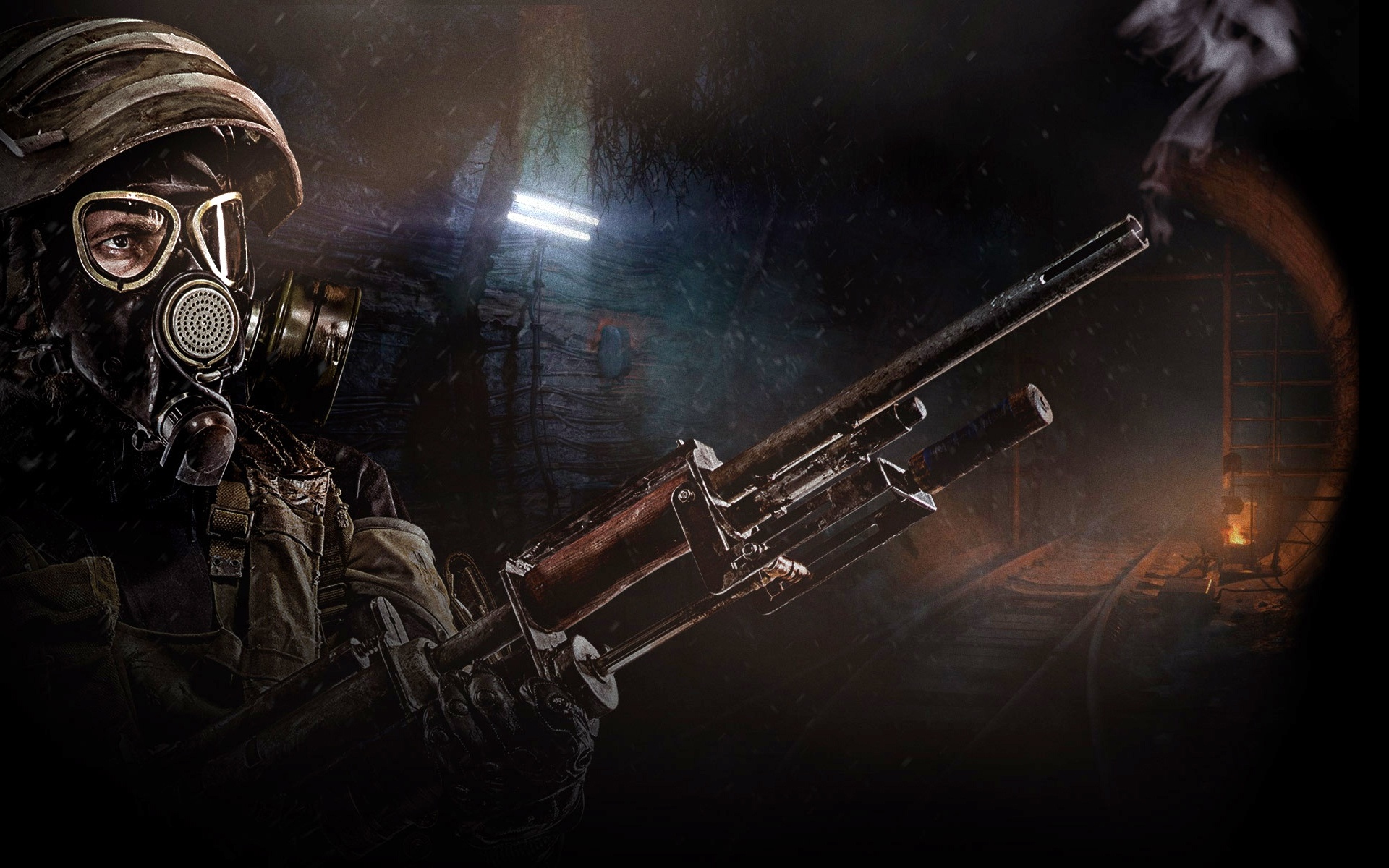 Description: A man in gas mask holding a gun in a dark room with a light coming from behind him and a bird flying overhead.