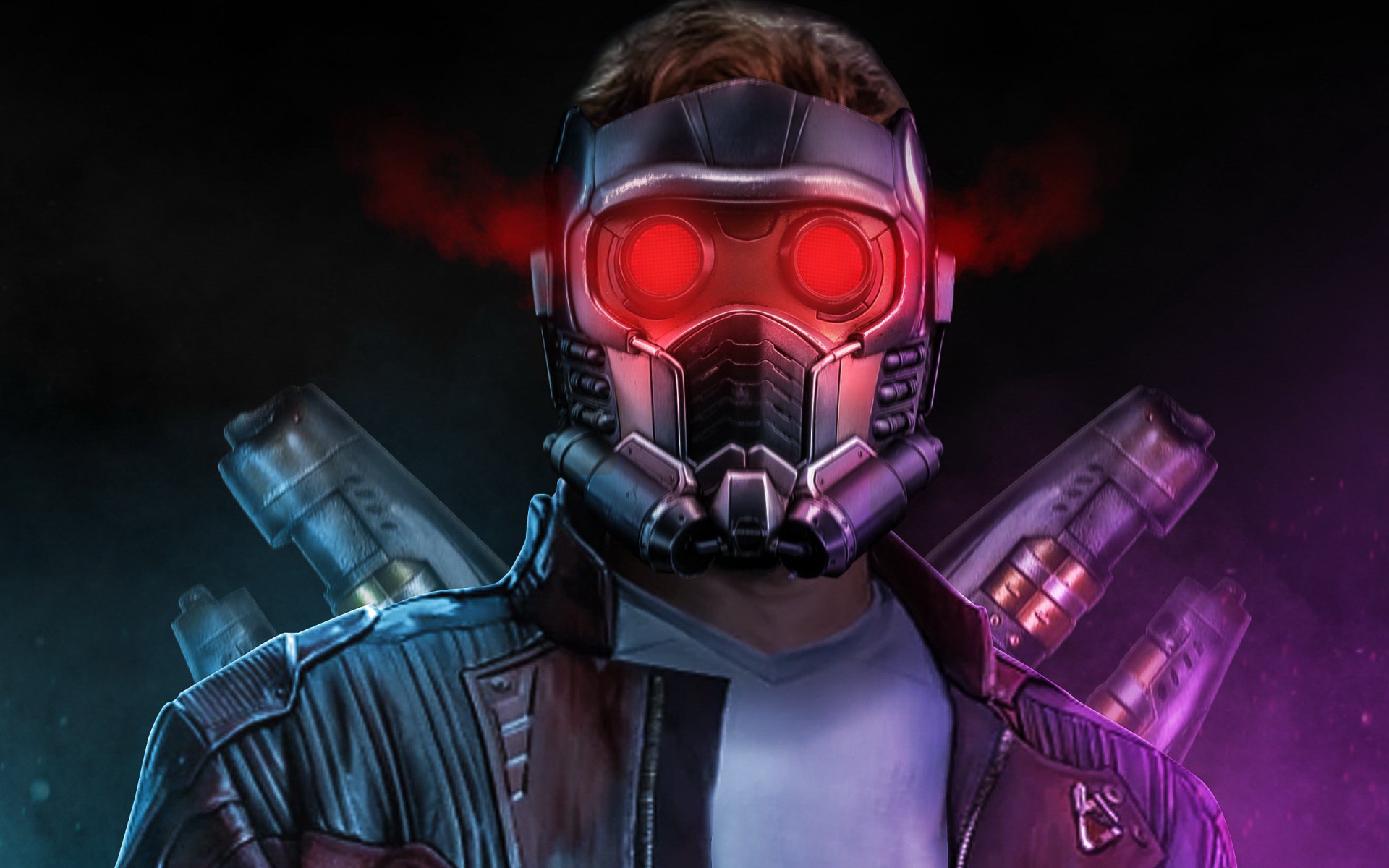 Description: A man in a gas mask holding two guns in his hand and a red light on his face is shining.