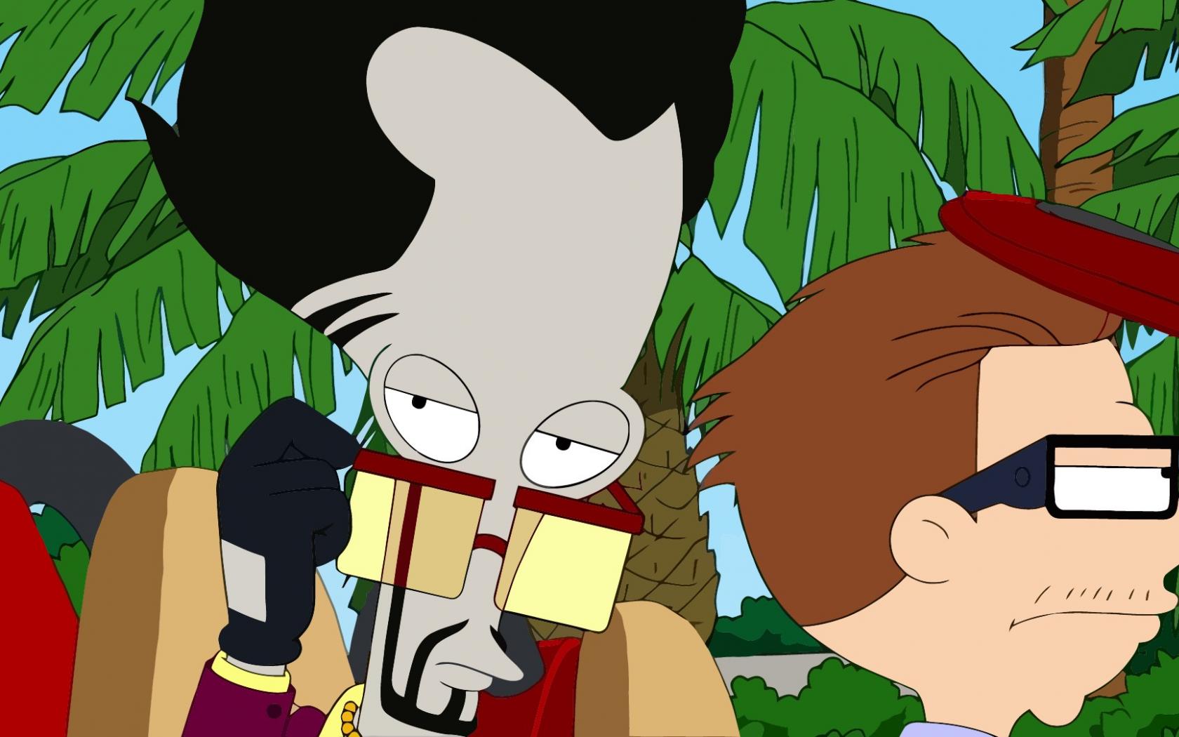 Description: A man with glasses and a cat on his back looking at a box of presents in front of him.