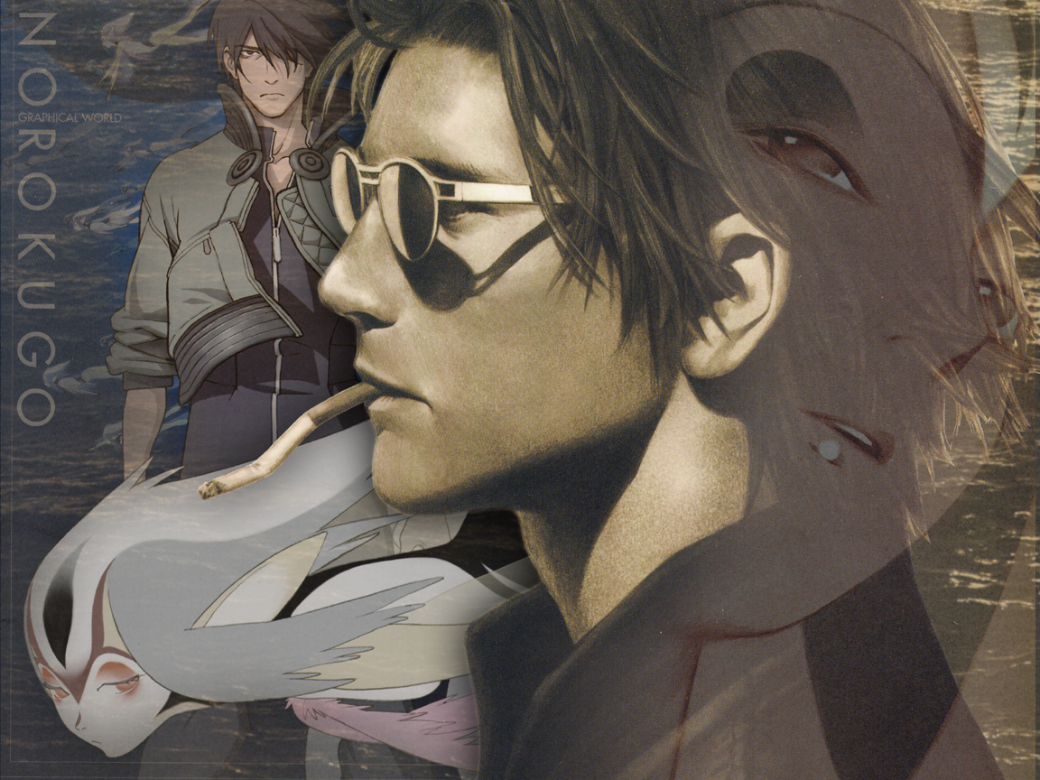 Description: A man with glasses and a cigarette in his mouth next to a woman with a gun in her mouth.