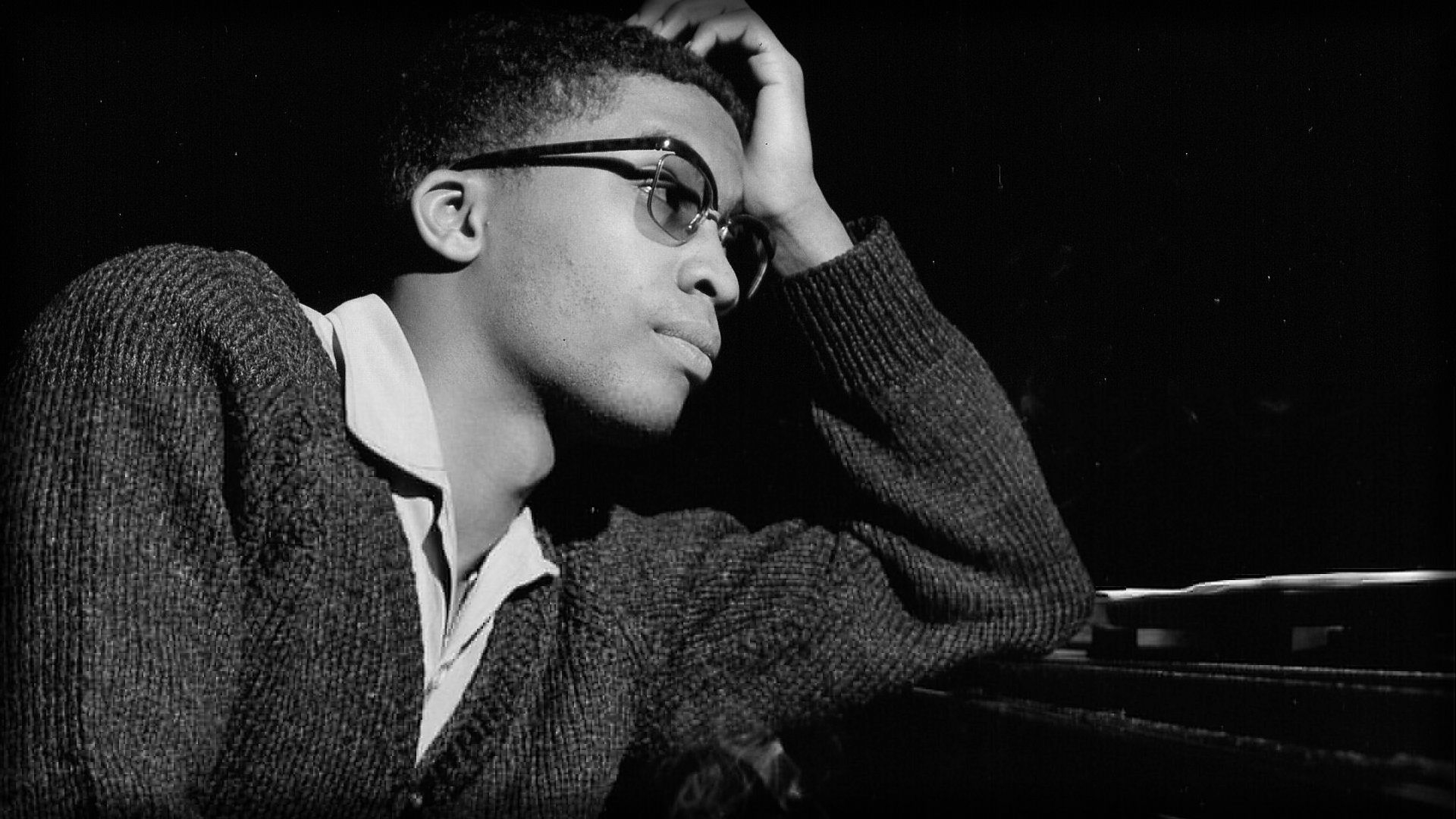 Description: A man with glasses sitting at a piano looking off to the side with his hand on his head and his hand on his head.