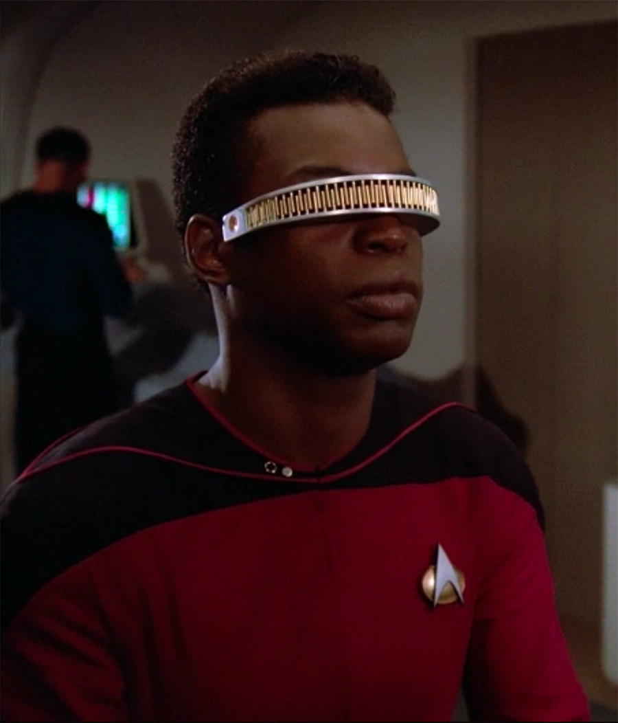 Description: A man wearing a pair of glasses with a star trek logo on it's forehead and a red shirt with a black and white collar.