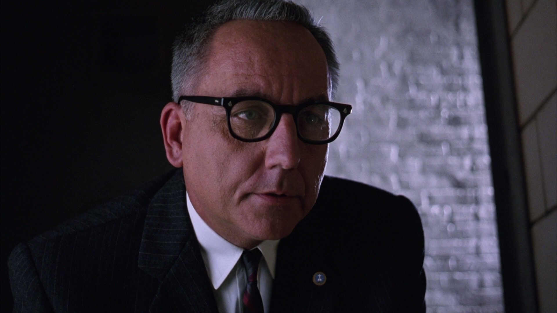 Description: A man wearing glasses and a suit looks at the camera in a dark room with a brick wall behind him.