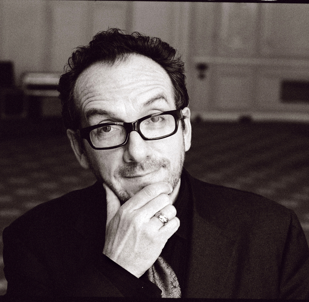Description: A man with glasses and a tie is posing for a picture with his hand on his chin and looking at the camera.
