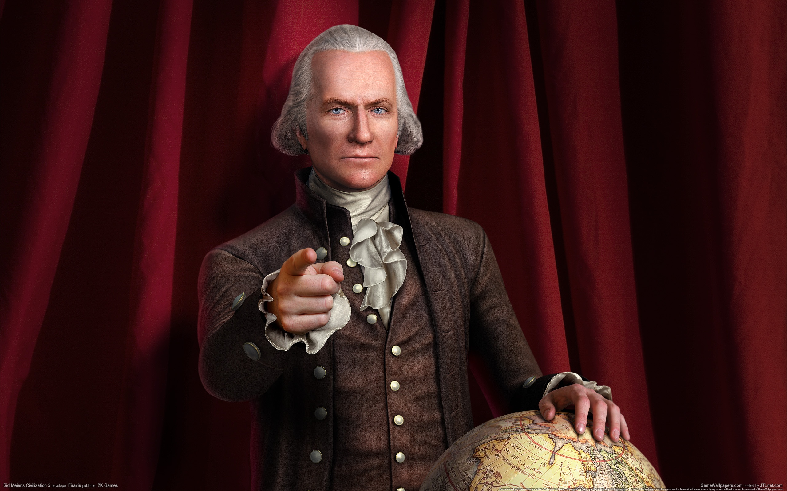 Description: A man in a brown coat holding a globe in his hand and pointing at it with a finger on it.