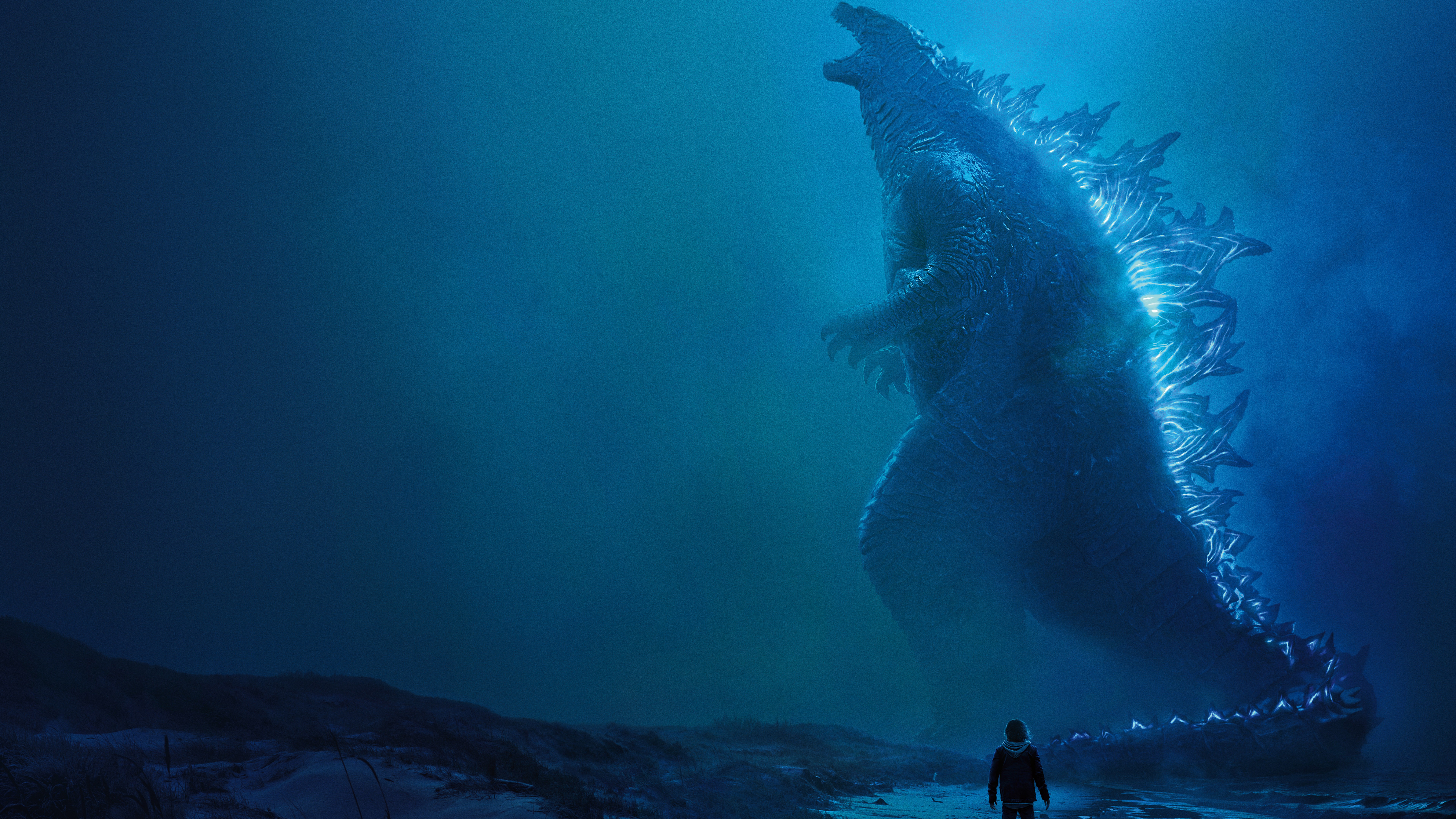 Description: A man standing in front of a giant godzilla in the ocean with a man looking at it from the water.