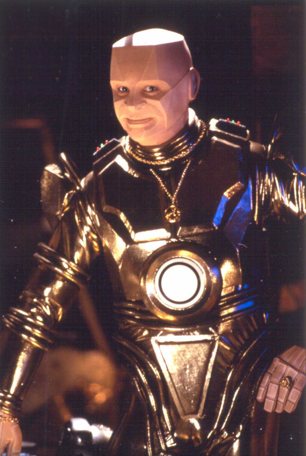 Description: A man in a gold suit with a helmet and a chain around his neck and hands on his hips.