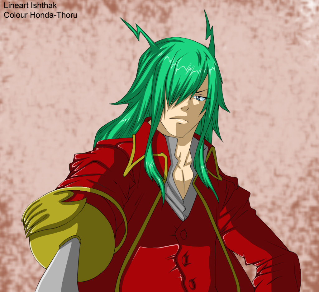 Description: A man with green hair and a red jacket with a sword in his hand and a red jacket with a green tail.